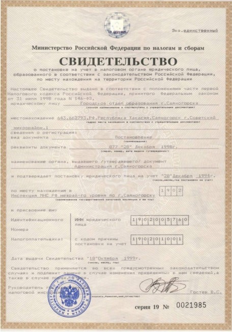 СВИДЕТЕЛЬСТВО о постановке на учет в налоговом органе юридического лица, образованного в соответствии с законодательством Россйской Федерации, по месту нахождения на территории Российской Федерации